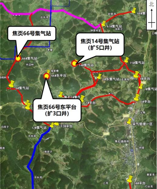 焦頁14平臺新建井口距離東側最近的散居民房258m,與東側架空電力線路約115m,與南側架空電力線路約81m,與西南側公路約55m。焦頁66號東平臺新建井口距離東北側最近的散居民房99m,與西北側散居民房約114m,與北側公路約96m,與南側架空電力線路約80m