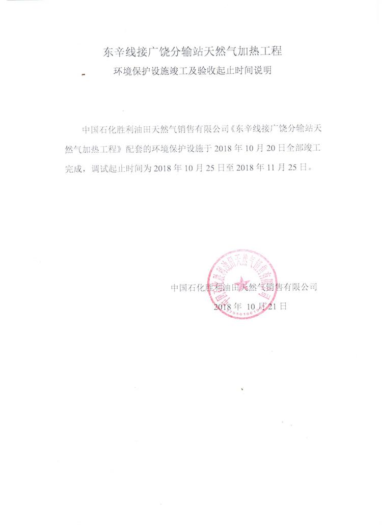 東辛線接廣饒分輸站天然氣加熱工程環(huán)境保護(hù)設(shè)施竣工及驗(yàn)收起止時(shí)間說明