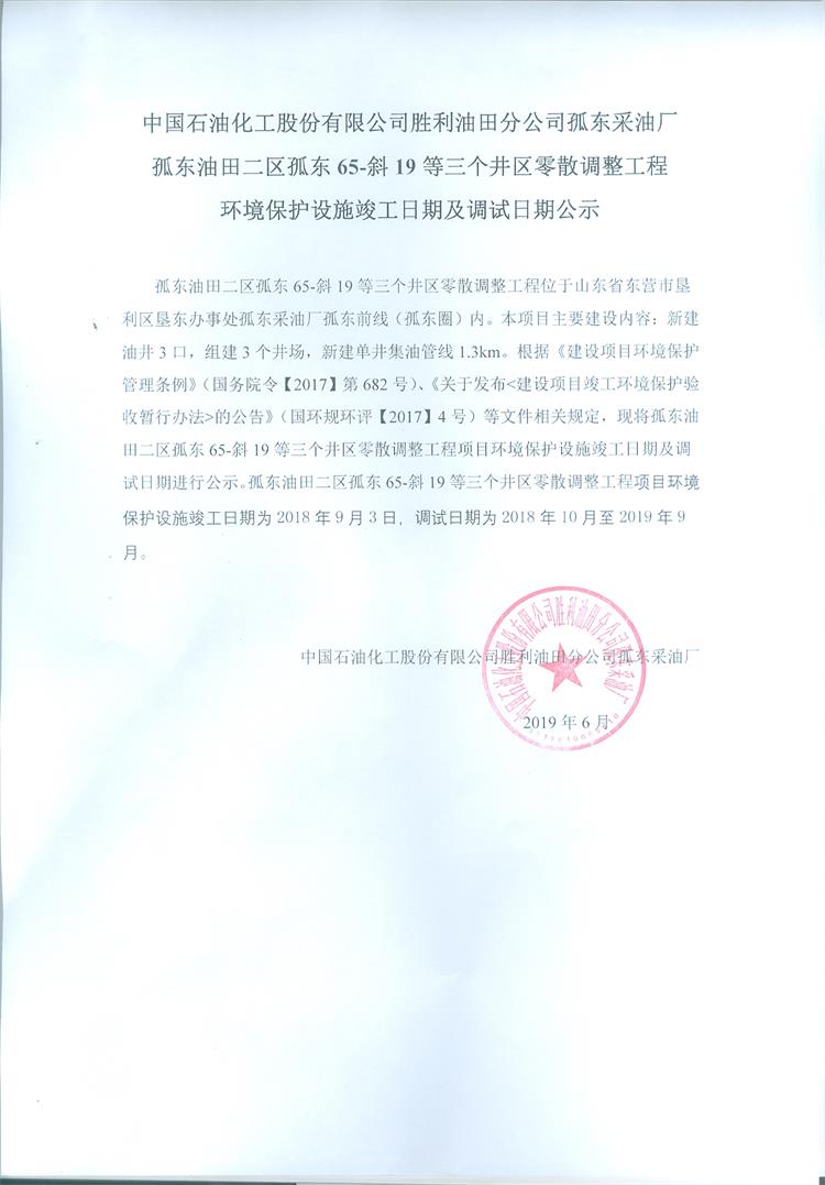中國石油化工股份有限公司勝利油田分公司孤東采油廠孤東油田二區(qū)孤東65-斜19等三個井區(qū)零散調整工程環(huán)境保護設施竣工日期及調試日期公示
